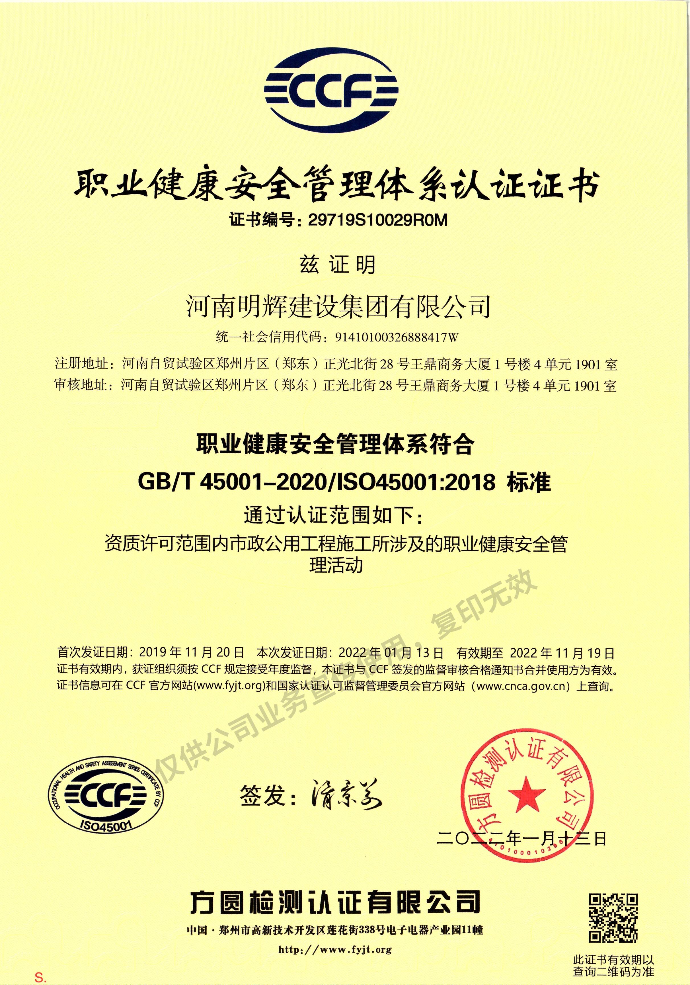 职业健康安全管理体系认证证书